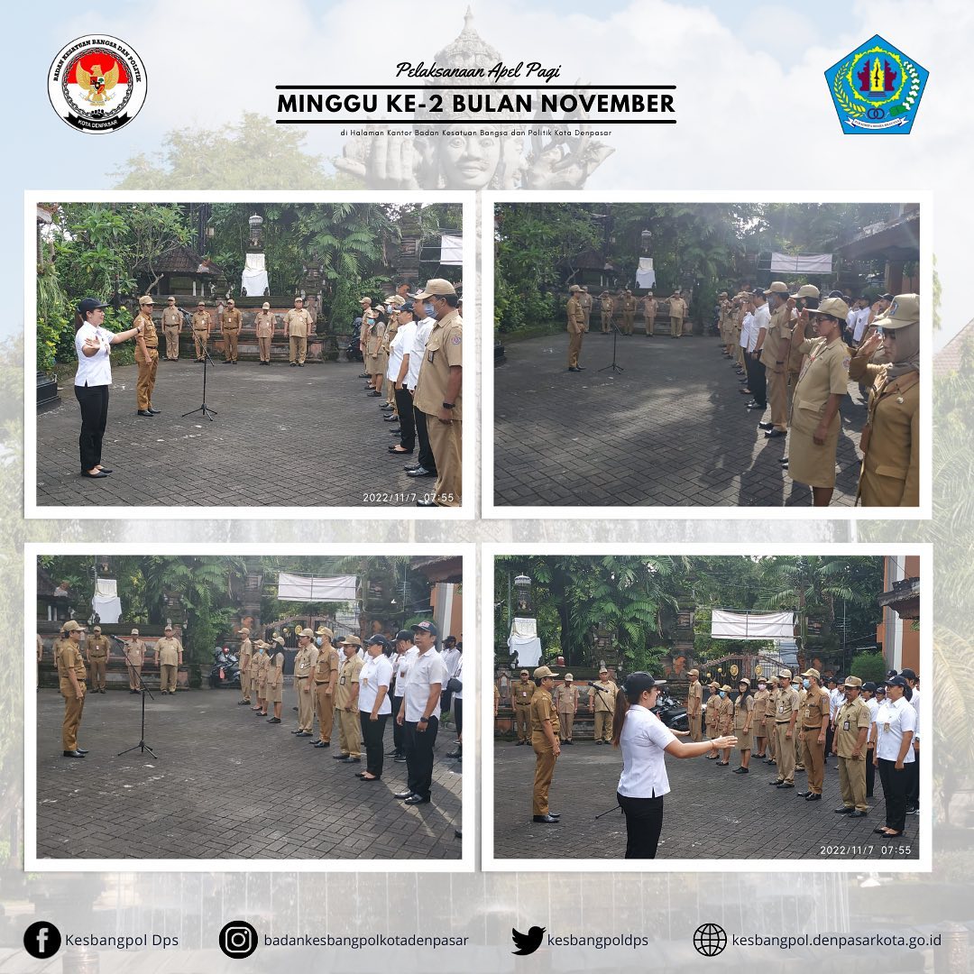 Pelaksanaan Apel Pagi Setiap Hari Senin pada Minggu ke-2 Bulan November 2022 di Halaman Kantor Badan Kesatuan Bangsa dan Politik Kota Denpasar.