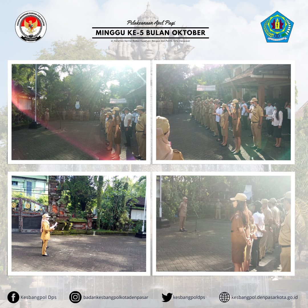 Pelaksanaan Apel Pagi Setiap Hari Senin pada Minggu ke-5 Bulan Oktober 2022 di Halaman Kantor Badan Kesatuan Bangsa dan Politik Kota Denpasar.