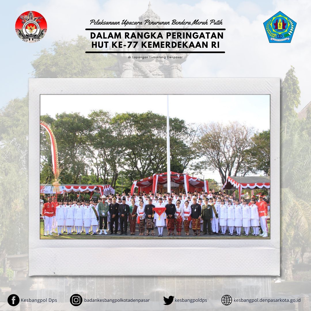 Pelaksanaan Upacara Penurunan Bendera Merah Putih Peringatan HUT Ke-77 Kemerdekaan Republik Indonesia Tahun 2022 dengan tema "Pulih Lebih Cepat Bangkit Lebih Kuat", pukul 15.00 WITA - 16.35 WITA bertempat di Lapangan Lumintang Denpasar, Jl. Gatsu VI F Banjar/Link Lumintang Desa Dauh Puri Kaja, Kecamatan Denpasar Utara, Kota Denpasar.
